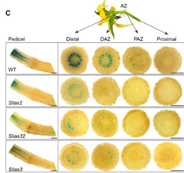鑒于 SlGATA6 調控生長素運輸載體 SlLAX2的表達,該研究通過生長素特異性抗體的免疫熒光雜交技術及離區(qū)組織切片分析,在細胞層面揭示了生長素的空間分布模式,首次實現(xiàn)了生長素梯度的空間維度解析,證實了 SlGATA6 是維持這一梯度的關鍵。通過免疫熒光雙標試驗發(fā)現(xiàn),SlIAA3 與 SlIAA32 蛋白信號強度在遠軸端到近軸端方向呈現(xiàn)相反的分布規(guī)律,即遠軸端 SlIAA32 信號強,SlIAA3 信號弱,近軸端則反之。值得注意的是,SlIAA32 和 SlIAA3 的總信號強度由遠軸端到近軸端顯著減弱,形成了離區(qū)生長素的信號梯度。由于 SlIAA32 和 SlIAA3 均可以提高生長素信號,且破壞 SlIAA32 和 SlIAA3 的功能都能夠導致生長素信號嚴重受損,表明 SlIAA32 和 SlIAA3 是建立生長素響應梯度的關鍵因子。