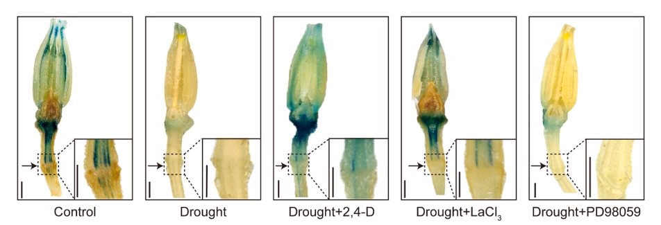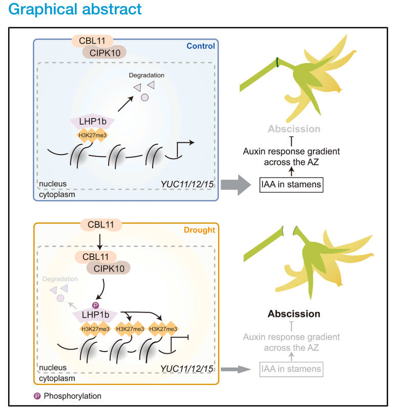 該研究發(fā)現(xiàn),干旱脅迫下SlCBL11/SlCIPK10-SlLHP1b信號模塊誘導(dǎo)番茄落花的作用機(jī)制。干旱脅迫激活SlCBL11-SlCIPK10鈣離子感受器模塊,磷酸化修飾SlLHP1b。磷酸化的SlLHP1b通過H3K27me3依賴的方式結(jié)合下游生長素合成基因SlYUCs的啟動子區(qū)域抑制其表達(dá),導(dǎo)致雄蕊中生長素合成減少,破壞離區(qū)生長素梯度,誘發(fā)番茄落花。該研究揭示了干旱下鈣信號通過表觀遺傳調(diào)控生長素合成參與番茄落花的分子機(jī)制,進(jìn)一步完善了植物逆境響應(yīng)中鈣信號與表觀遺傳調(diào)控的分子網(wǎng)絡(luò),還為培育耐旱、高產(chǎn)的品種提供了潛在的基因靶點(diǎn)。研究成果對提高逆境下的番茄產(chǎn)量,提高經(jīng)濟(jì)效益具有重要的指導(dǎo)意義。該研究獲國家重點(diǎn)研發(fā)計(jì)劃項(xiàng)目、國家自然科學(xué)基金面上項(xiàng)目和青年科學(xué)基金等項(xiàng)目支持。