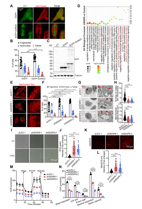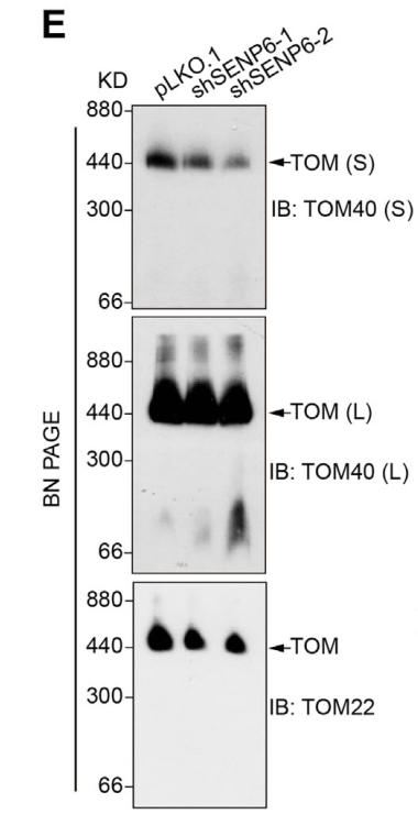 SUMO 化通過(guò)共價(jià) SUMO 結(jié)合賴氨酸殘基來(lái)動(dòng)態(tài)修飾蛋白質(zhì),由 E1 激活酶、E2 結(jié)合酶和 E3 連接酶介導(dǎo),而去 SUMO 化則由 SENPs 調(diào)控。與泛素化介導(dǎo)的降解不同,SUMO化會(huì)調(diào)節(jié)蛋白質(zhì)的活性、定位和穩(wěn)定性,從而影響基因表達(dá)、基因組完整性、細(xì)胞周期、細(xì)胞凋亡和免疫功能。最近的研究表明,SUMO化/去SUMO化參與調(diào)控線粒體的生物合成、動(dòng)力學(xué)、線粒體自噬和線粒體未折疊蛋白反應(yīng)(UPRmt)。此外,線粒體蛋白質(zhì)輸入障礙和蛋白質(zhì)穩(wěn)態(tài)受損會(huì)引發(fā)酵母中線粒體蛋白質(zhì)的SUMO化,這表明SUMO化可能也在線粒體蛋白質(zhì)輸入系統(tǒng)中發(fā)揮作用。SENP6特異性地裂解polySUMO2/3鏈,從而調(diào)控DNA修復(fù)、細(xì)胞凋亡、衰老、著絲粒組裝、炎癥、小膠質(zhì)細(xì)胞極化、血管生成和核結(jié)構(gòu)。其功能障礙與淋巴瘤、核纖層蛋白病和骨骼衰老有關(guān)。然而,SENP6 在線粒體穩(wěn)態(tài)中的作用仍未得到深入研究。