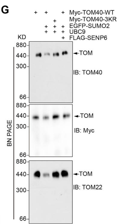 從機(jī)制上講,SENP6敲低通過(guò)SUMO化TOM40來(lái)抑制TOM復(fù)合物的組裝,從而阻礙線粒體蛋白質(zhì)輸入過(guò)程(包括TOM40前體),最終破壞線粒體穩(wěn)態(tài)。此外,研究還觀察到,CCCP 處理導(dǎo)致 3×Tg-阿爾茨海默病 (AD) 小鼠或 Aβ1-42 肽刺激細(xì)胞的腦內(nèi)線粒體中 SENP6 減少,同時(shí) TOM40 SUMO 化增加??傊?,這些結(jié)果表明 Aβ1-42 的積累可能通過(guò)抑制 SENP6 來(lái)增強(qiáng) TOM40 SUMO 化,從而通過(guò)蛋白質(zhì)輸入障礙損害線粒體穩(wěn)態(tài),并可能促進(jìn) AD 的病理過(guò)程。該研究闡明了在線粒體應(yīng)激過(guò)程中TOM40 SUMO 化/去 SUMO 化調(diào)控線粒體輸入過(guò)程中的作用。