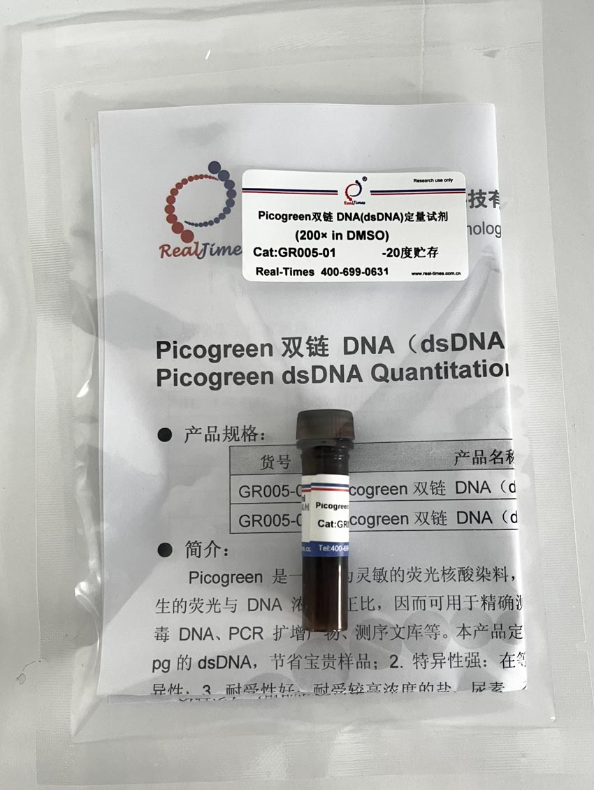 Picogreen 是一種極為靈敏的熒光核酸染料,其僅在與DNA 雙鏈結合后才發(fā)出熒光,且所產生的熒光與 DNA 濃度呈正比,因而可用于精確測量多個來源的 dsDNA,包括基因組 DNA、病毒 DNA、PCR 擴增產物、測序文庫等。本產品定量具有以下優(yōu)勢:1. 靈敏度高:可檢測低至200 pg的dsDNA,節(jié)省寶貴樣品;2. 特異性強:在等摩爾的RNA存在的條件下,對dsDNA具有特異性;3. 耐受性好:耐受較高濃度的鹽、尿素、乙醇、氯仿、去垢劑、蛋白或瓊脂糖,可以直接定量PCR擴增產物而無需從反應混合物中純化DNA。4. 易于使用-只需在樣品中加入染料,等待5分鐘,然后讀數(shù)即可,且適用于96和384孔板;與大多數(shù)基于熒光的酶標儀和熒光計兼容。5. 適用范圍廣:可適用于PCR的分析、芯片樣品、DNA損傷分析、酶活分析、基因組DNA定量以及復雜混合物中dsDNA的檢測和病毒DNA定量等多種領域。