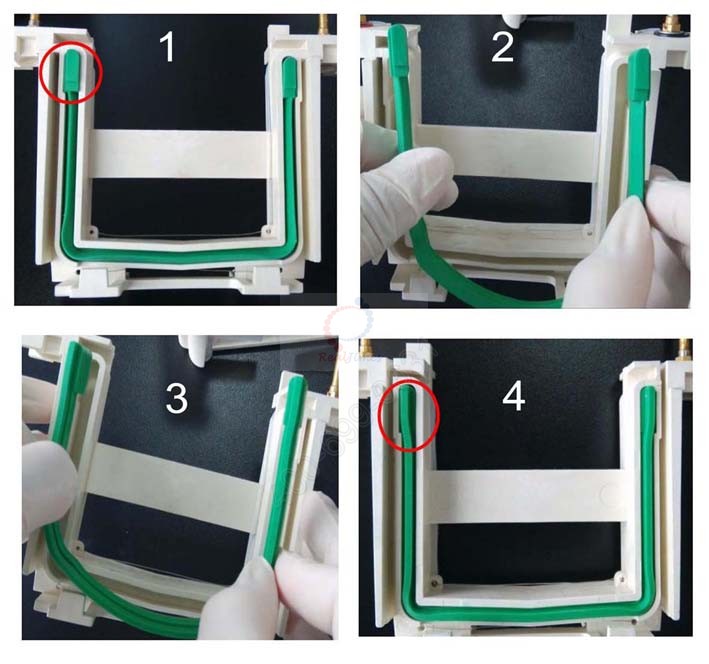 2.將密封條旋轉(zhuǎn) 180 度,正面朝里,反面朝外(圖示3),重新裝回電泳槽中并將四周壓實(shí)(圖示4),防止漏液。