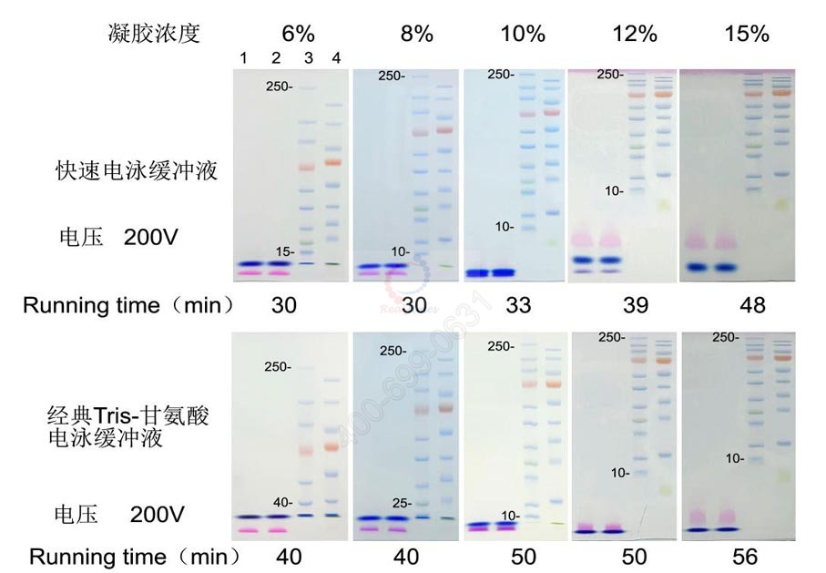 SDS,pH8.3)相比,本快速電泳液可以大幅加快電泳速度,縮短電泳時(shí)間。推薦200-250 V恒壓電泳,低于10%膠濃度凝膠通常20-35分鐘就能完成電泳。